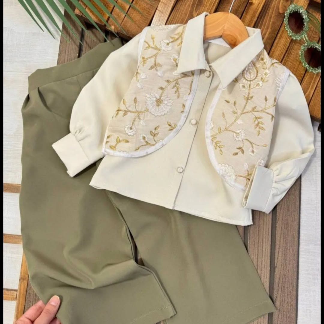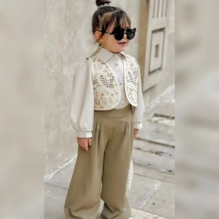 سایز۳:قد بلوز ۴۳ پهنا ۳۷ آستین ۴۳ شلوار ۶۹ کمر در حالت کشسانی ۷۰ دورران ۵۲ قد ژیله ۳۳ پهنا ۳۵